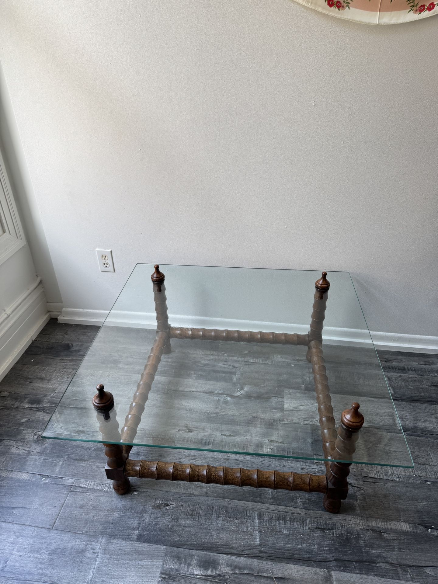 Lightly used vintage Rosewood carved and glass coffee table top. Has easily removable pegs for cleaning. Height: 16 in Length: 36 in Width: 36in