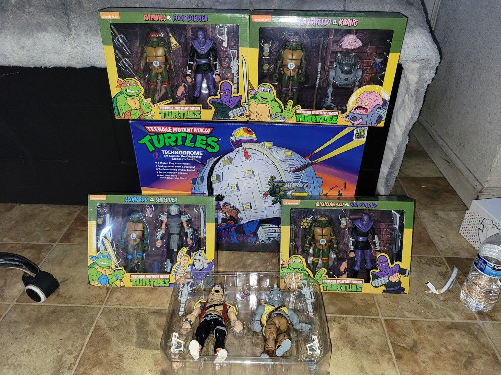Neca Teenage Mutant Ninja Turtles lot Everything is sealed except bebop and rock steady, rock steady has a broken leg but figures are complete 500 OBO