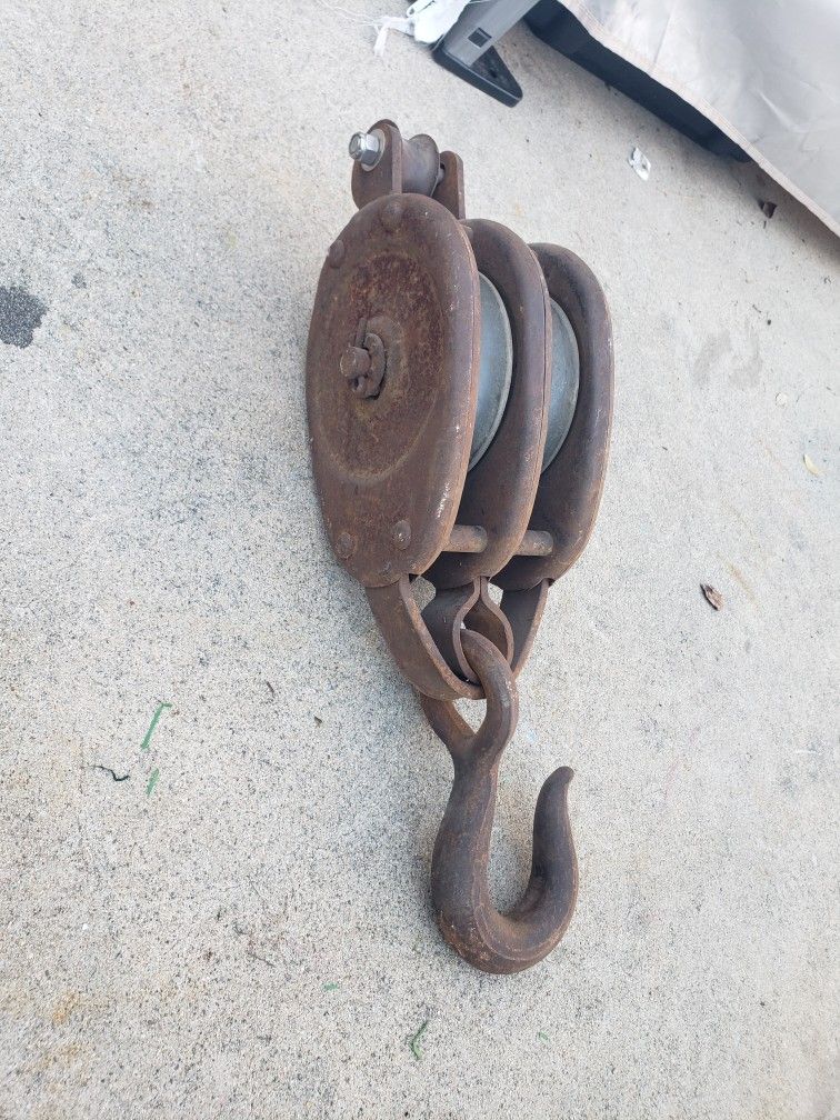Antique vintage industrial metal block and tackle double pulley. Works perfect.