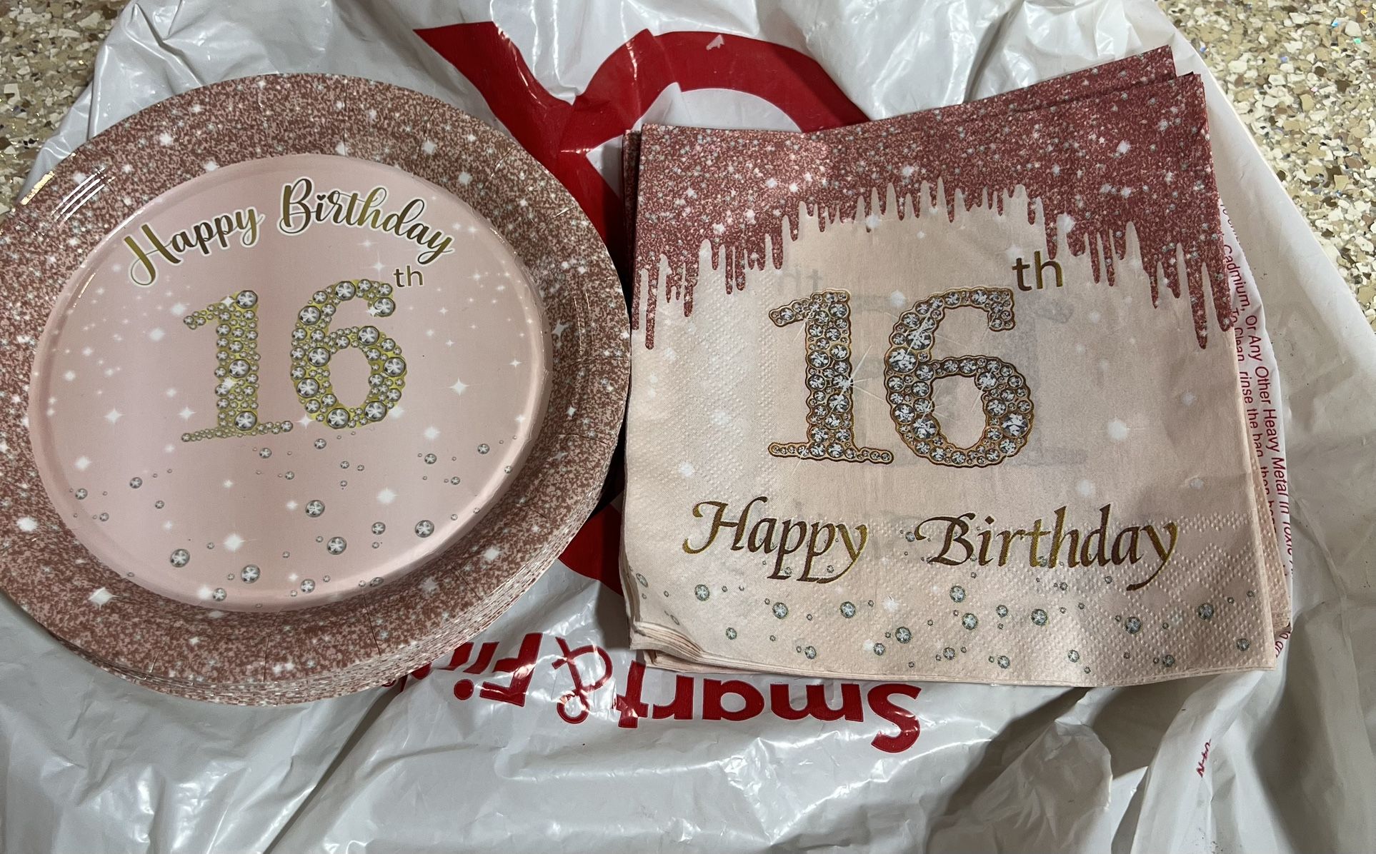 Sweet 16 banner, 1 used table cover, about 20 cake plates and napkins, balloons, Mylar balloons, and ribbon banner curtain Pick up/ Cash only in Chula Vista East Palomar area