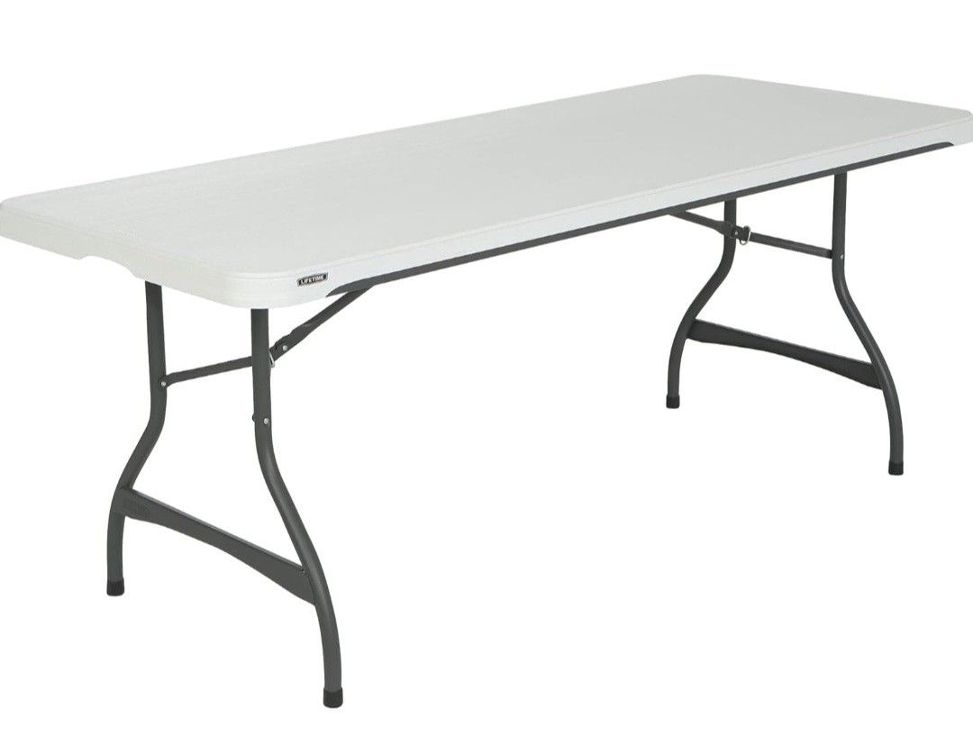 Brand new HEAVY DUTY ( can hold up to 300 lbs.) collapsible 6’Plastic Foldable Table with carrying Handle, making it easy for one person to handle. Indoor/ Outdoor use, can withstand weather elements if left outside Stain proof and Finish is White and is great for Picnic, Party and Camping . it's big enough to seat 6-8 people Dimensionsare 72" L x 30" W x 29" H Purchased with warranty for $120 + tax Only asking $40 OBO Must GO will deliver if close by