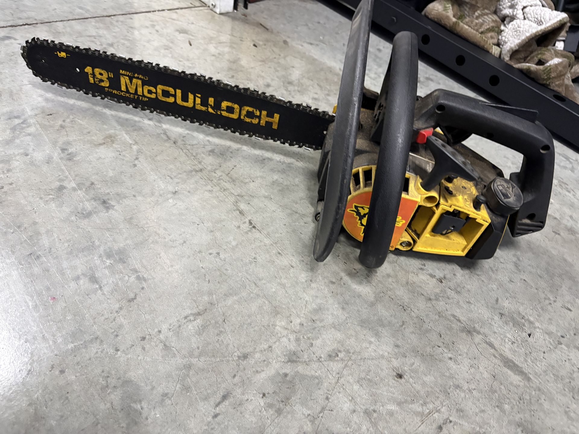 gasoline-powered chainsaw from the brand McCulloch, likely a vintage model such as the Mac 110. Brand: McCulloch Bar Length: 18 inches Power Source: Gasoline Safety Note: Always wear protective gear (gloves, goggles, hearing protection) and ensure the chain brake is functioning before operating.