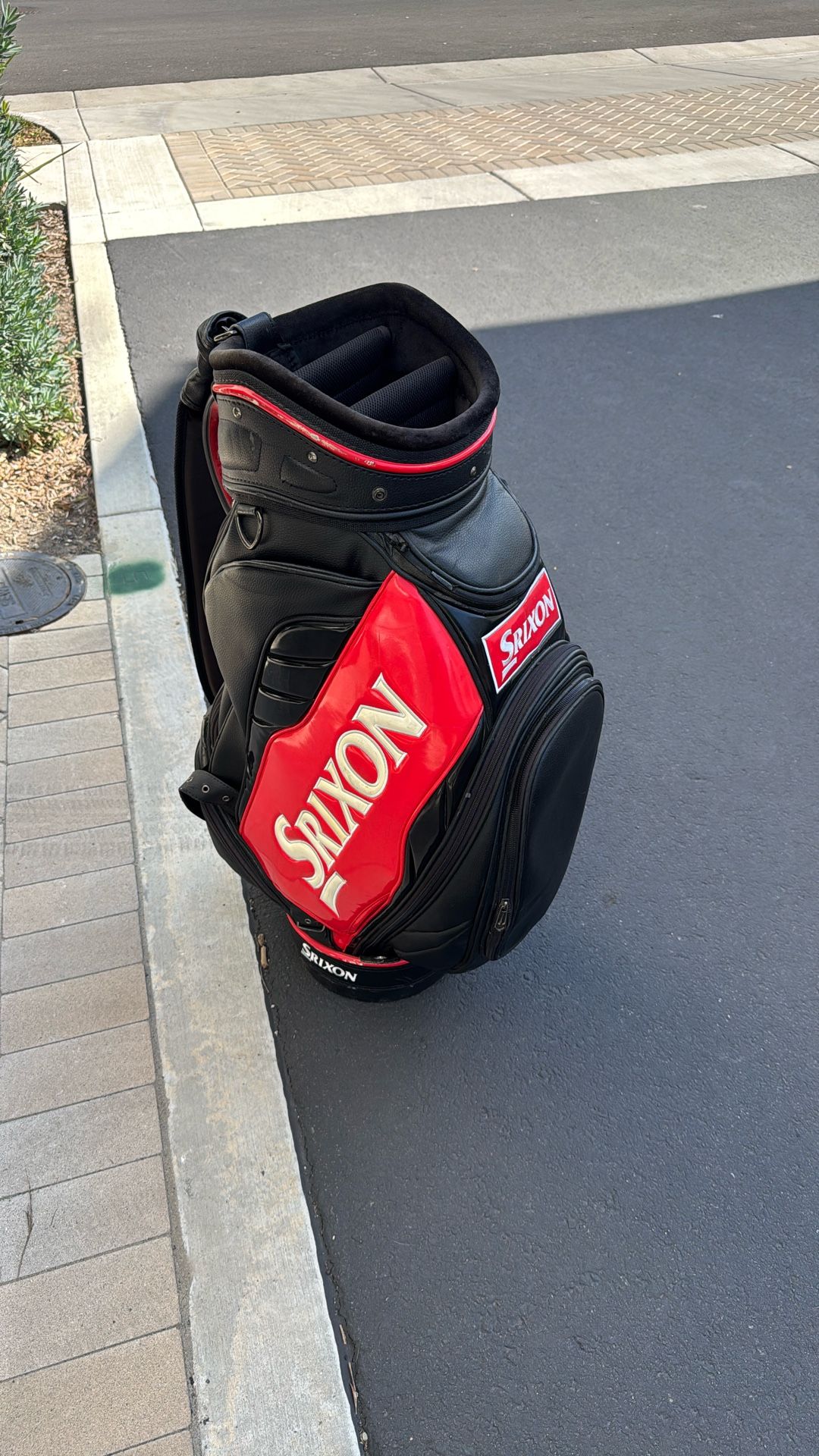 Red and Black Cart Bag with 6 dividers and 9 pockets. It comes with the rain cover. ***Doggo not included