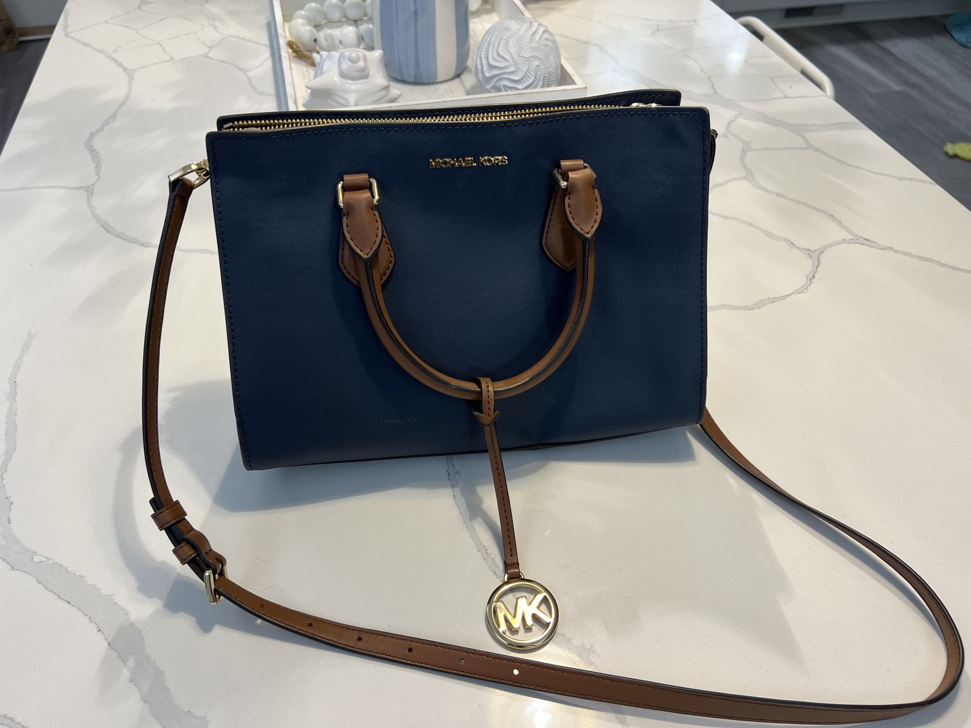 Michael Kors Navy Brown Satchel Gold Hardware Adjustable Strap Bag Charm
