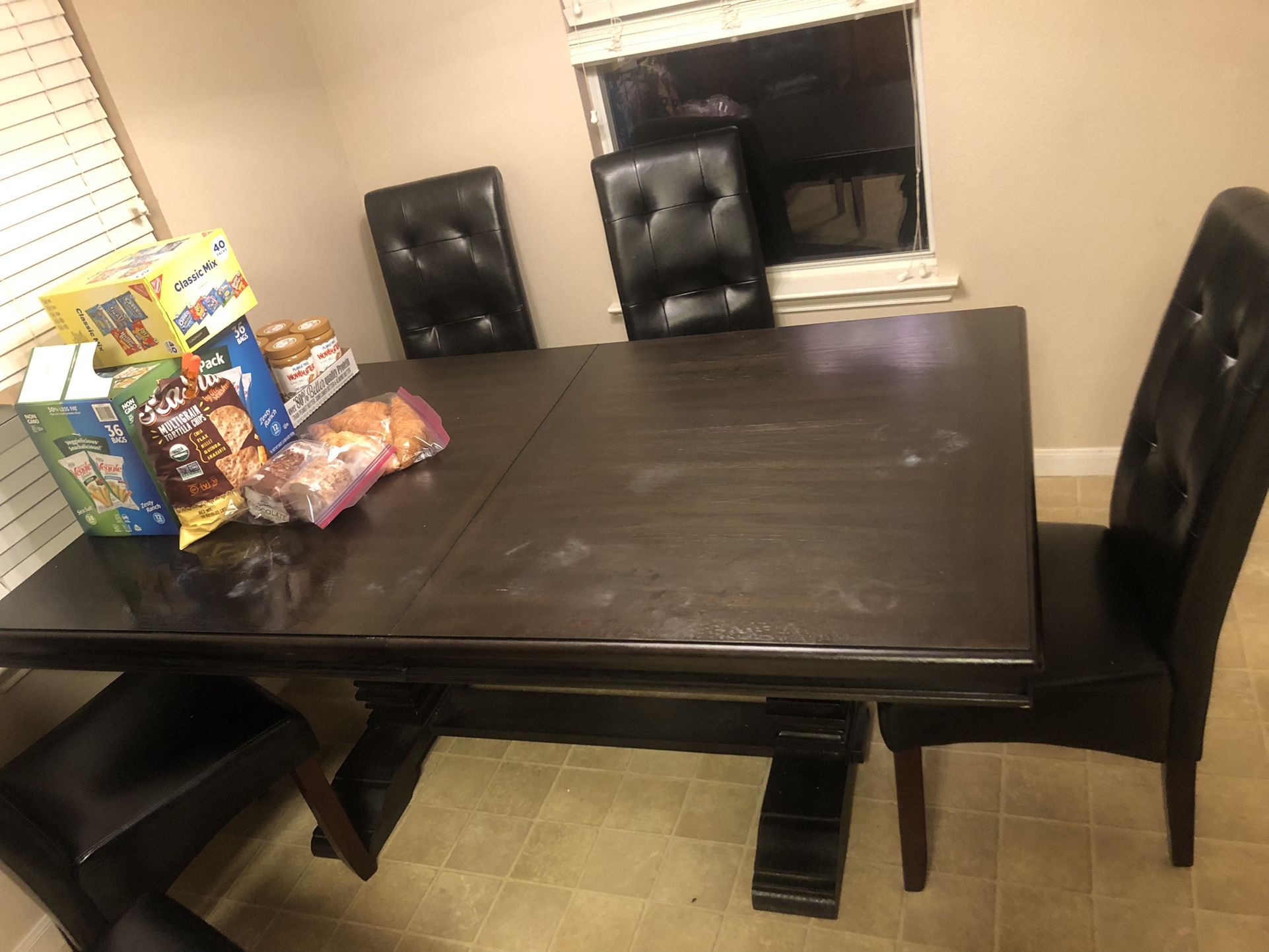 We bought a table for large family but we don’t really use it . Since we go to other members of family to eat dinners . Paid 1400 less than a year ago comes with 8 chairs black leather finish on the chairs and has an extra leaf very heavy . Has a few heat marks on it but that’s all asking 400 so I can get a different table . Purchased from rooms to go .