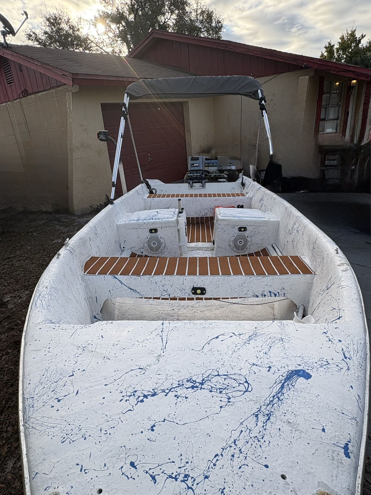 14’ Skiff with Yamaha 25Hp 2 Stroke ;Trailer Included Willing to trade for nice GMC 33s or 35s 6 lug with cash on top Skiff Clean Title Very clean solid hull Brand new canopy navigation lights Courtesy lights Stern light Amplifier with four speakers Bilge Sea deck flooring Anchor Key Characteristics * Type: Small, skinny-running fiberglass skiff, similar to a Jon boat but often custom. * Size: Around 14 feet long, often 14.7 feet. * Shallow Draft: Designed to run in very shallow water (ankle-deep). 1995 Yamaha 25hp 2-stroke Compression is 110 both cylinders Low hours Motor has been completely gone through It works as it should Everything has been serviced spark plugs thermostat fuel filter zincs water pump kit Yamaha gear lube including new prop and driveshaft seals, OEM parts Tiller and pull start works fine Trailer is included is in good working condition. Very nice. Everything has been gone through and released it’s ready. Only bill of sale will be provided for it.