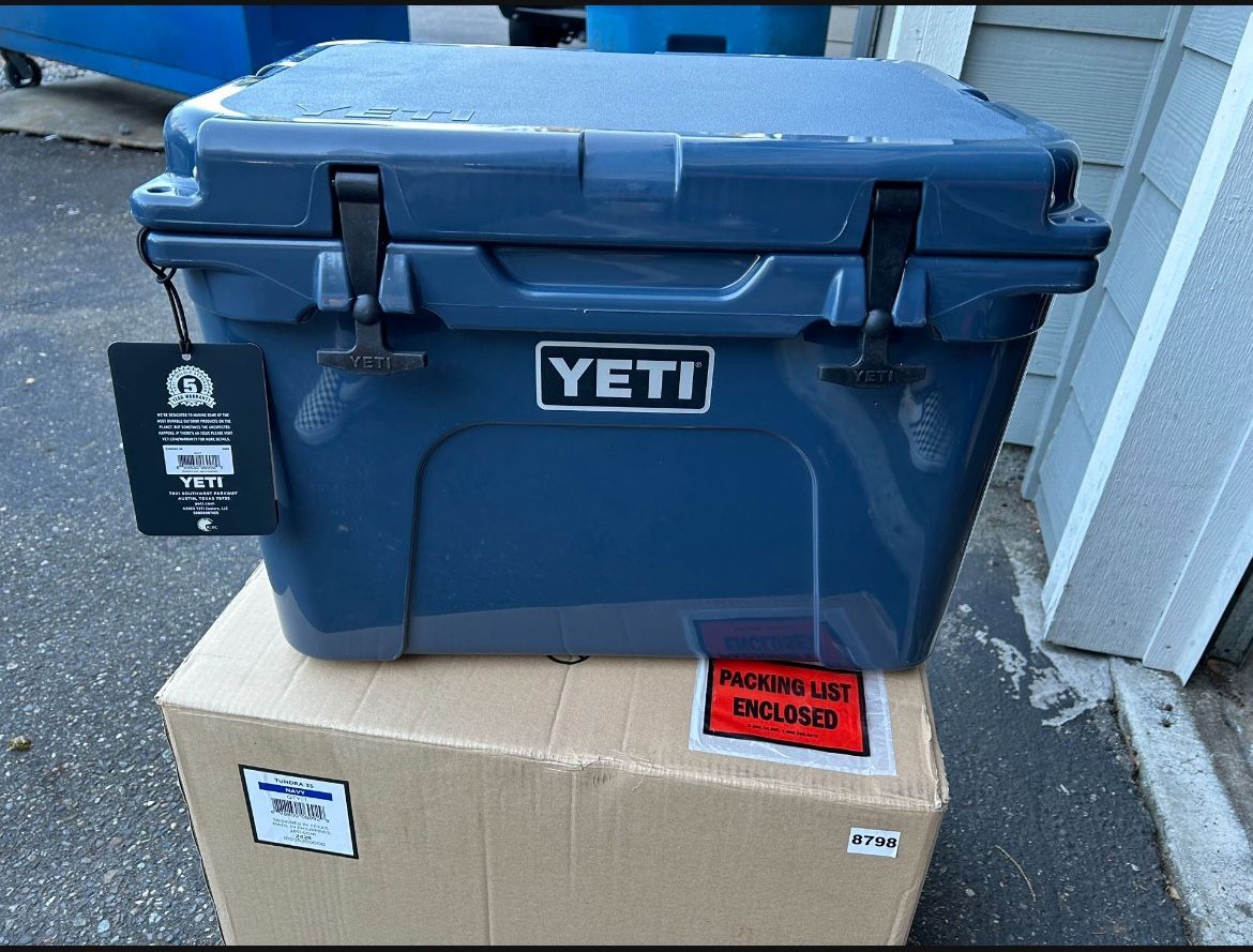 New in box - Yeti Tundra 35 Navy Blue Keeps food and drinks cold for up to 2 days. Gasketed lid shuts like a freezer door. Thick rubber latches and feet. Holds 20 12-oz. cans and ice. Includes metal dry goods basket and drain plug. Thanks!