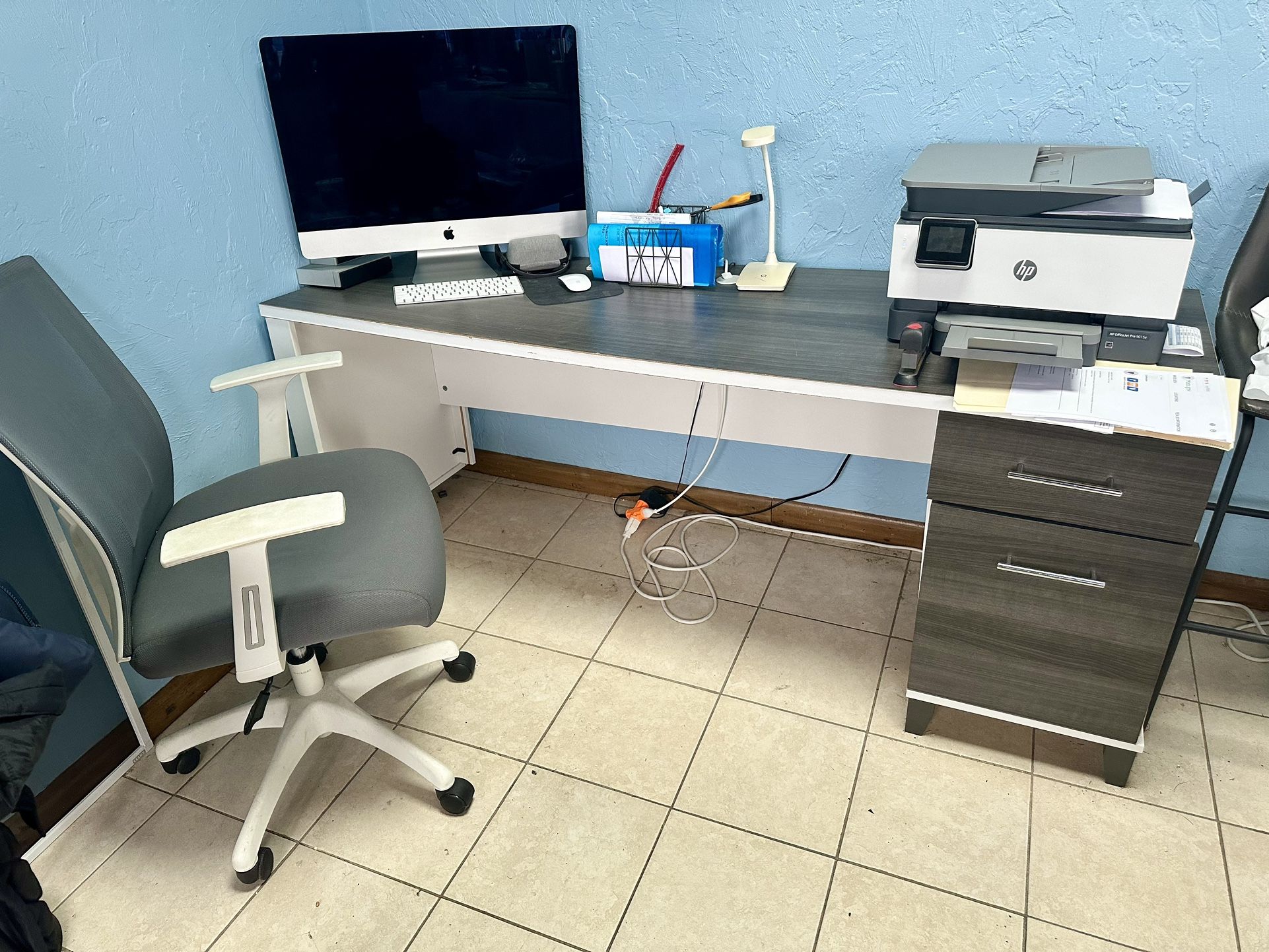 Two years old. Contemporary gray and white plus matching adjustable office chair.