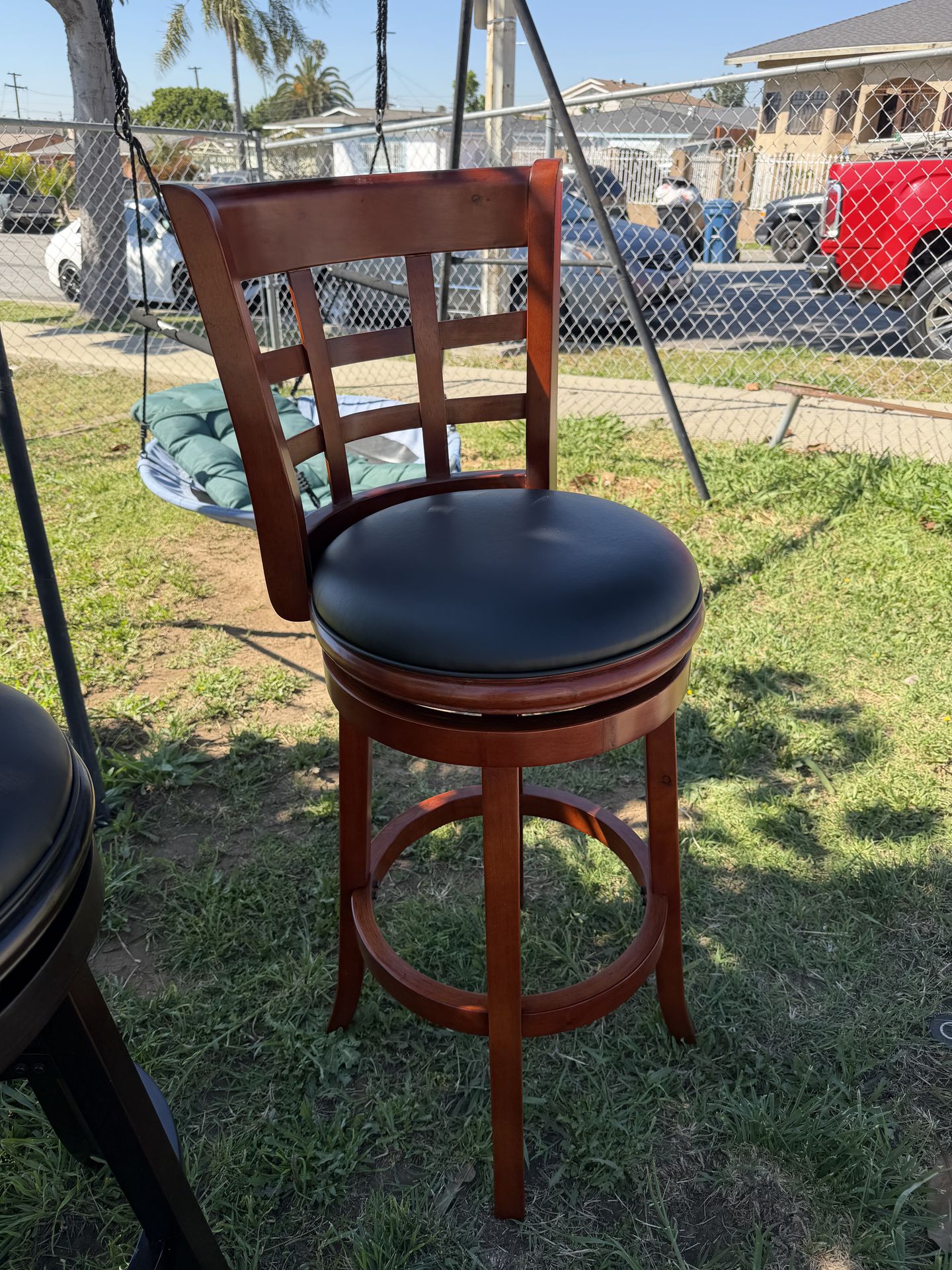 29 inch Swivel Counter Stool, Solid Wood, Faux Leather Light Cherry Product Dimensions 19.5"D x 18"W x 43.5"H Color: Cappuccino Frame Material: Metal, Wood Seat Material Type: Solid Wood Style: Modern 360-degree swivel with full steel ball-bearing mechanism and Footrest offers comfort and stability High-density foam cushion for maximum comfort and dimension