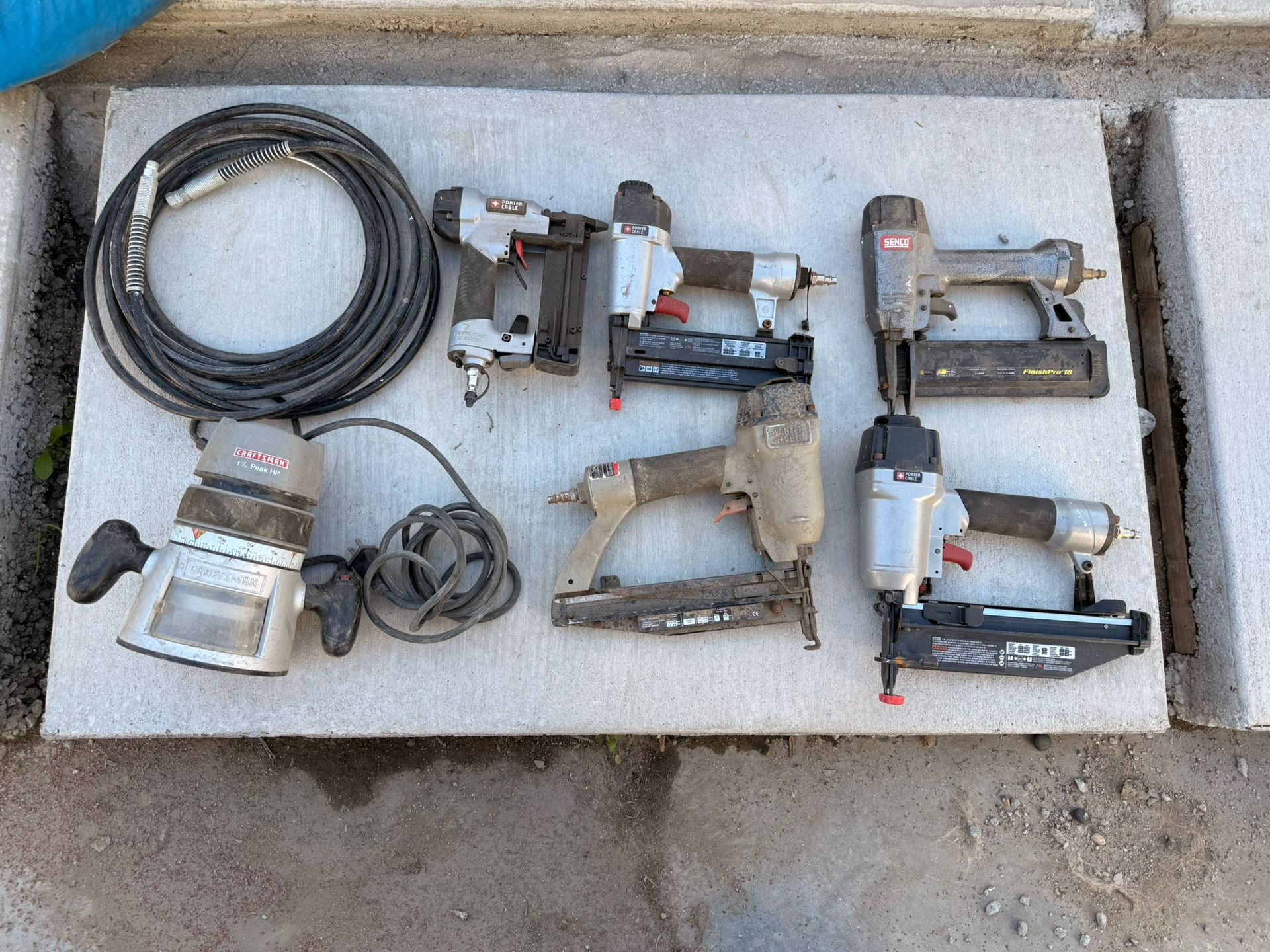 Selling a mixed lot of construction tools. Includes several pneumatic nailers, an older router, and an air hose. Tools have been stored for a while and may need cleaning or maintenance. What’s included: • Multiple air nail guns (various sizes/types) • Heavy-duty router • Long air hose • All sold together as one lot I’m selling AS-IS. Great for someone who repairs tools or needs parts.