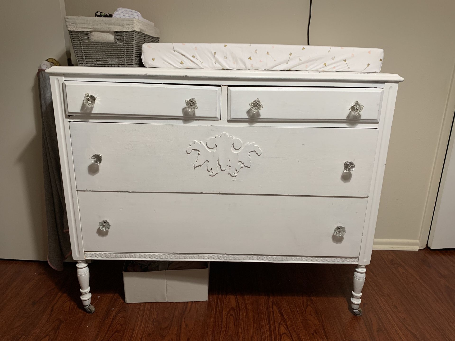 Antique White Dresser with original castor wheels This is an antique and has some wear, middle drawer does not slide very easily, and the back is missing a piece of wood (does not affect use) Cash only, you pick up Xposted Read Less