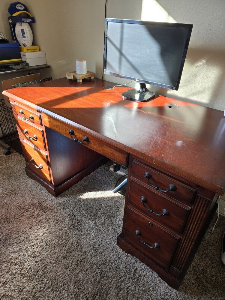 Elegant natural wood desk with rich warm tones. It's very heavy, perfect for an office or den. Gracefully aged over the years. Has multiple drawers to include file cabinets and locks. Dimensions available upon requests.