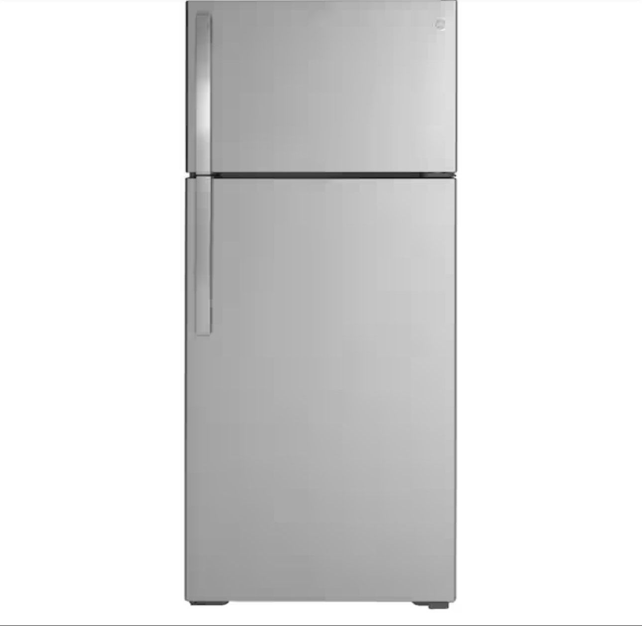 FR-1 New In Box (Slightly Dented on Bottom in the back see photos for reference) Retail $1,061 GE 17.5 cu. ft. Top Freezer Refrigerator in Stainless Steel, ENERGY STAR Dimensions: H 67.375 in, W 28 in, D 32.625 in