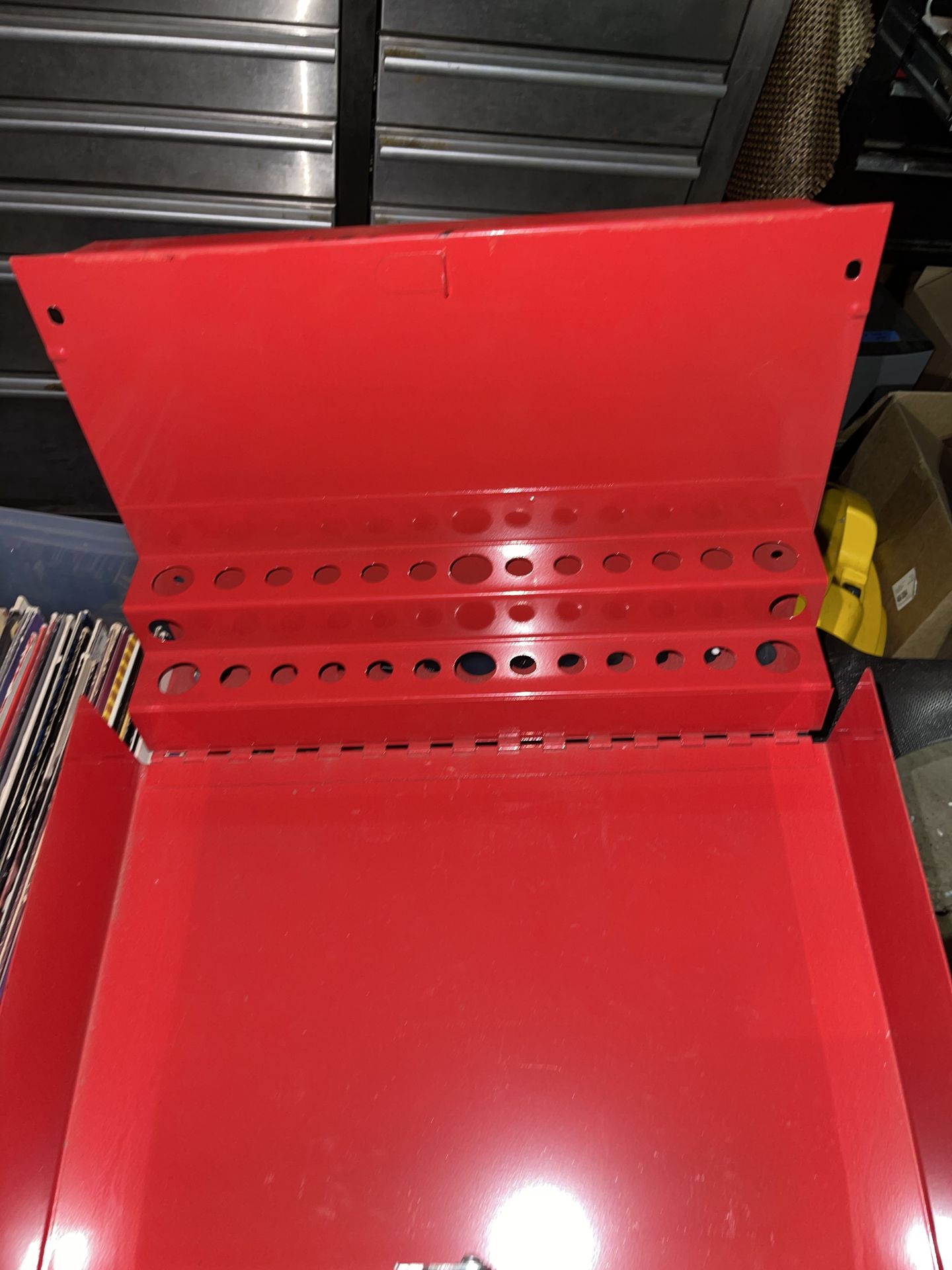 It is designed to attach to service carts, such as the Sunex 8003SC, 8005SC, and 8013A. * The holder features a locking lid for security and has a durable powder-coated finish. * It has 2 or 3 different hole sizes and can hold up to 26 items. * The dimensions are approximately 16" x 11" x 3.75".