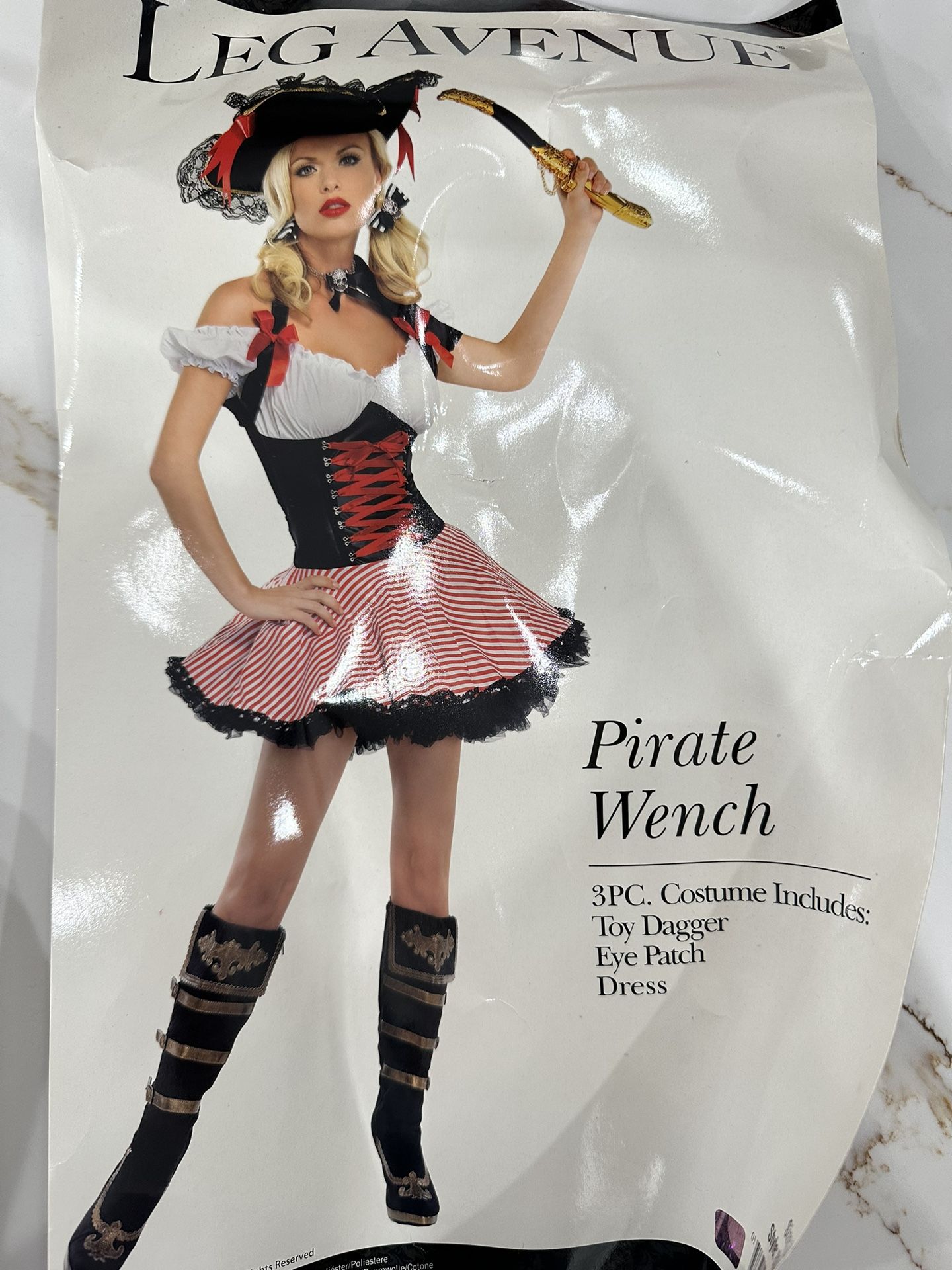 Pirate wench 3-piece costume includes toy dagger, eye patch, and dress. I also have the red petticoat skirt that is worn under the skirt and black velvet hat. Only worn once. Size is medium. All yours for $70.