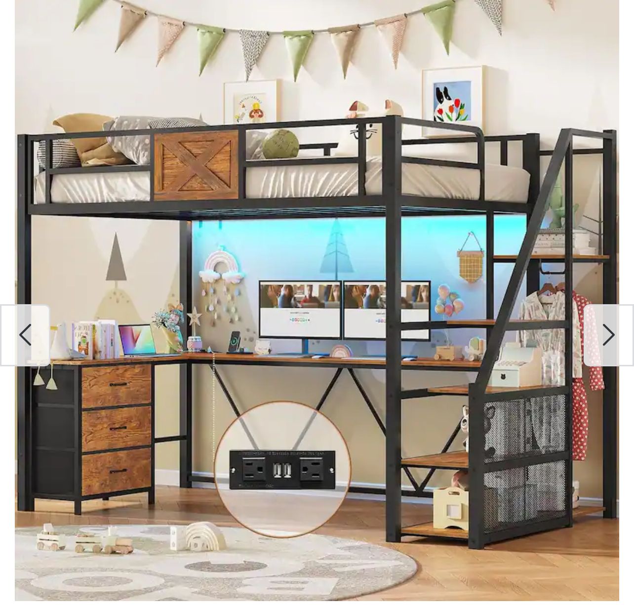 Top highlights Style Modern Size Twin Special Feature Cord Rewind Color Rustic Brown Frame Material Metal Product Dimensions 93.7"L x 41.3"W x 70.86"H Convertible loft bed with stairs and L-shaped desk: The twin loft bed's storage stairs can be installed on the left or right side. The L-shaped desk Size is 74.8"L*14.2"W and 41.3"L*11.8"W. It can hold three desktop computers, a laptop, and other items. The 58-inch high space underneath the loft bed is perfect for studying or working. Perfectly suited for small spaces and small rooms.The bed's desktop is made of FSC certified wood. Safe and Storage-Friendly Staircase Loft Bed: Unlike other beds with ladders, ours has a staircase design that makes climbing up and down much safer and easier. Twin loft bed's staircase shelves give you space to store books, toys, sneakers, and more. Loft bed stairs are built from super sturdy boards that can hold up to 200 lbs, so even adults can use them safely. Practical Storage Functionality: The loft bed with desk includes a wardrobe, three fabric drawers, and storage staircase. The hanging rod on the side of the staircase provides a convenient place to hang hangers, scarves, or clothes. Three fabric drawers and storage staircase shelves can hold your books, documents, household printer, photos, decorations, and other items. LED Loft Bed with USB: This loft bed comes with RGB LED light strips remote control via APP, over 60,000 colors and 29 flashing modes, or even sync the lights to your music and with timer function. The metal Twin size loft bed comes with charging station with 2 outlets and 2 USB ports, so you can easily charge your gaming gear, tablet, printer, or phone. You'll never have to worry about lacking power outlets! Sturdy Metal Loft Bed: Our loft bed is built tough with heavy-duty square metal for durability and stability. The top bunk can hold up to 400 lbs, and the sturdy stairs make climbing up safe. Full-length guardrails keep you secure while sleeping, so both kids and adults can sleep worry-free. Easy Assembly: Itaar twin loft bed with desk and storage shelves comes with clear instructions. All parts are labeled for easy setup. If your loft bed arrives damaged, scratched, missing parts, or if you have any other issues, please contact us anytime. Itaar is always here to help.
