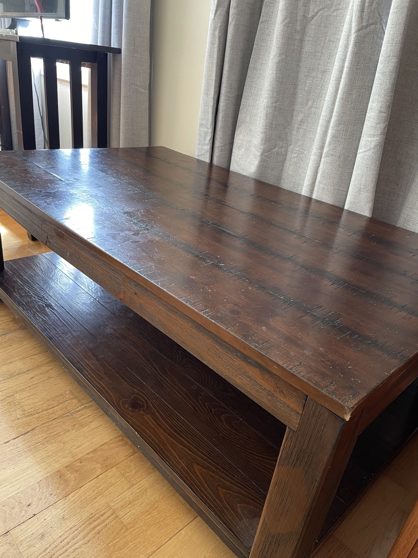 Beautiful large center table, perfect for living room or family space. Solid and still very functional. There is a crack underneath in the middle, but it doesn’t affect everyday use. Selling at a discounted price because of this. Pickup only.