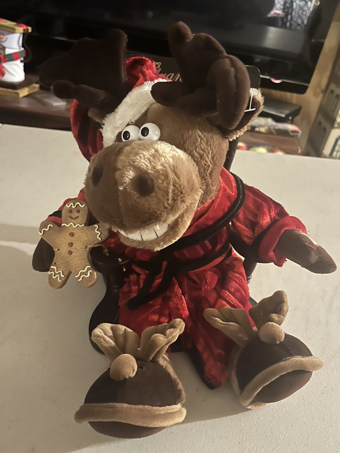 Works great. Displays well on a table or mantle. Legs fell off years ago and have been discarded. The DanDee Rocking Chair Singing Moose is a musical plush toy. Perfect for Christmas, this collectible item is part of a collection of animal-themed figurines focused on animation. The unique design of this singing moose, along with the holiday theme, makes it a fun and entertaining addition to any Christmas