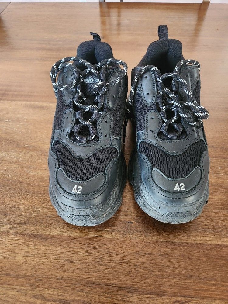 Hi, I have this balenciaga triple S black shoes just seating in my closet, I wear them 2 times only, so the condition of the are 10 out of 10, asking $700 for them, they retail for $1200 size are 42, so size 9 on mens. Send reasonable offers.