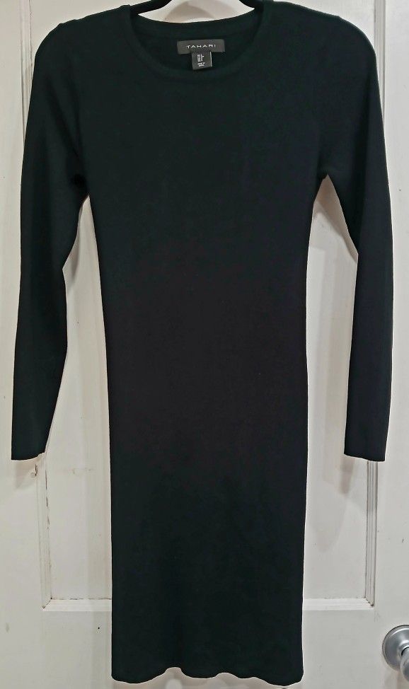 This is a Tahari black sheath dress in size small with a 3/4 sleeve and a collared neckline. It features an attached wrap detail and is made of polyester knit fabric. The dress is knee-length and has a pullover closure. Suitable for various occasions such as travel, parties, workwear, and formal events during the fall, winter, and spring seasons. Easy to care for as it is machine washable. Measurements on hanger: Shoulder to shoulder: 14.25 inches Bust: 33.5 inches Shoulder to bottom: 36 inches