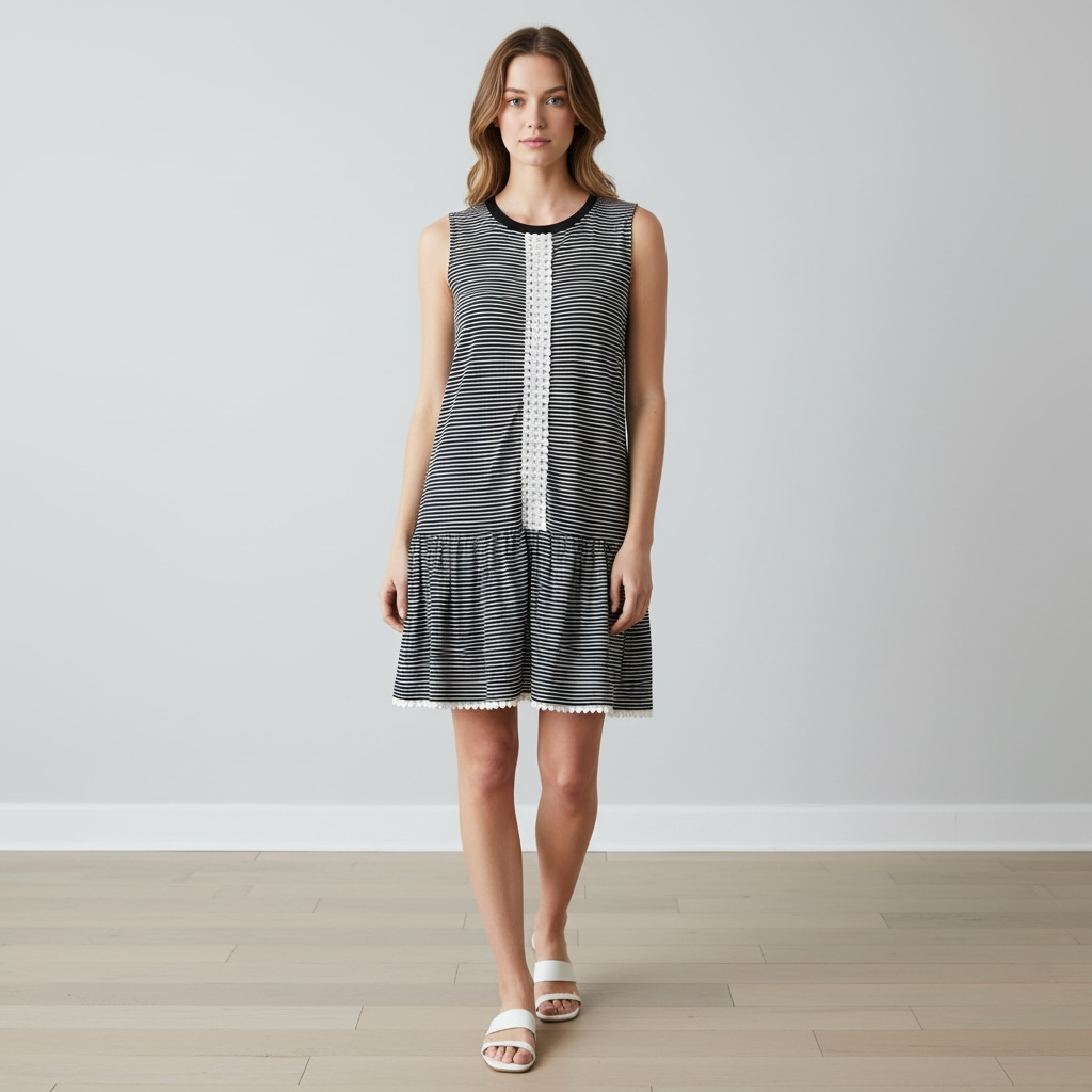 N Nicholas Striped Mini Dress Drop Waist Black/White Cotton Sleeveless Size 4 Preowned in excellent shape. This stylish mini dress features a classic black and white stripe design. Fabric Composition: Main: 100% cotton Trim: 100% wool Measurements (taken while the dress was lying flat, unstretched): Bust: approx 17" Waist: approx 17.5" Hips: approx 18.5" Length: approx 34" Please note, the model in photos is AI generated and provided for reference to give a general idea of how the item looks when worn. I will combine shipping on multiple item purchases Trending SEO Keywords: vintage, women's fashion, summer dress, striped dress, casual wear, designer, cotton dress, size 4, unique style, eBay finds