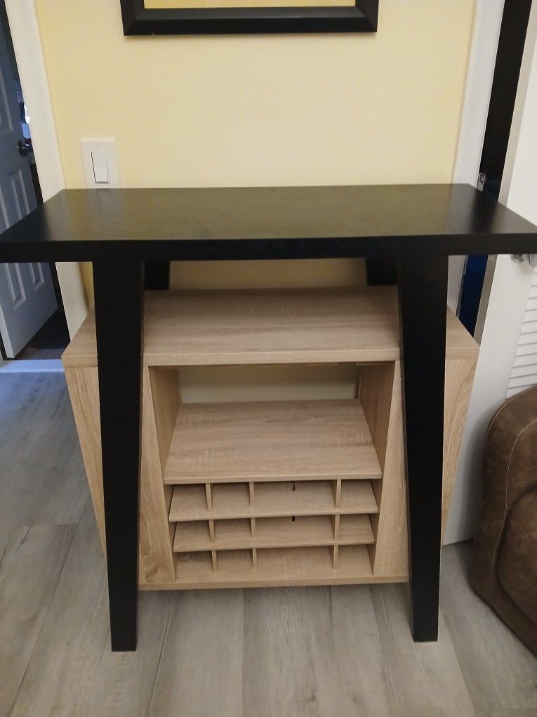 (W) 36" x (L) 15.5" x (H) 42" Beautiful black and weathered white wood finish Four Hanging Stemware Racks Holds up to 15 Wine Bottles Two Shelves on either side of Console with Holding Bar Complements any Decor