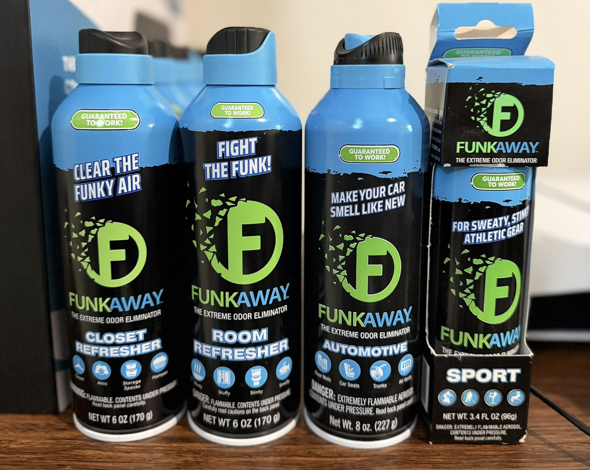 Funkaway the extreme odor eliminator! There are 4 different spray bottles to choose from Closet,Room,Automotive,Sport all brand new the closet,room, come in a 6oz bottle the automotive come in a 8oz bottle and the sport come in a 3.4oz bottle. Funkaway has a solution for anything that stinks π· including odor eliminators for shoes, laundry, pets, closets, cars, work and home π