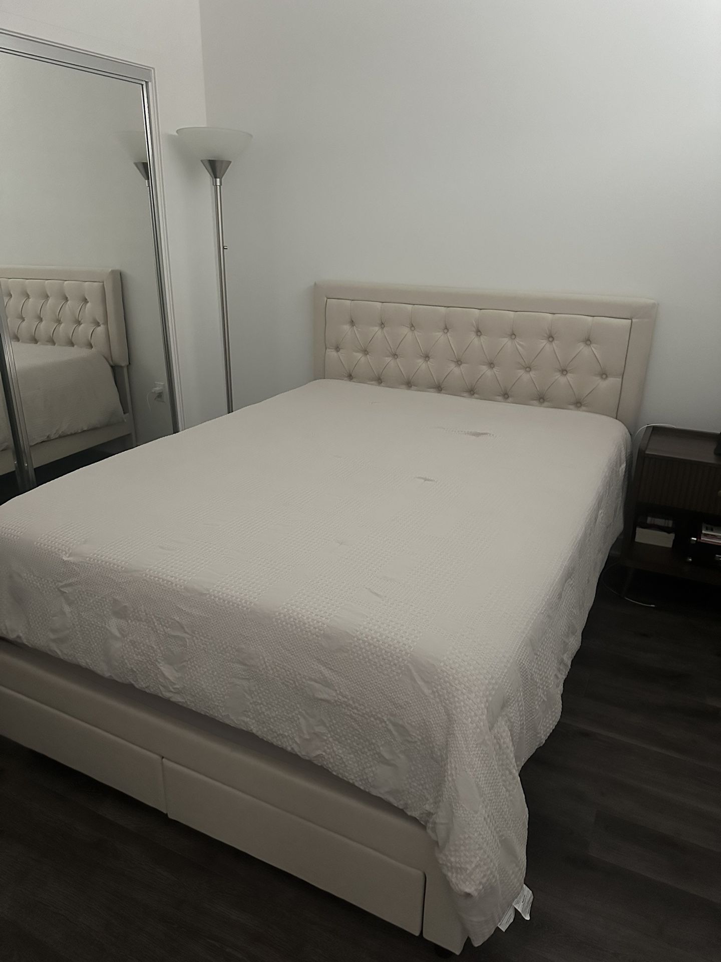 Size: Queen 2 drawer storage bed frame and headboard Color: Beige Comes with queen size mattress-is like new (always had topper on top of mattress ever since it was bought which is not for sale) Mattress info: Queen Mattress 12" Hybrid Cooling Gel Memory Foam Mattress with Individually Wrapped Pocket Coils, Medium Firm Support.