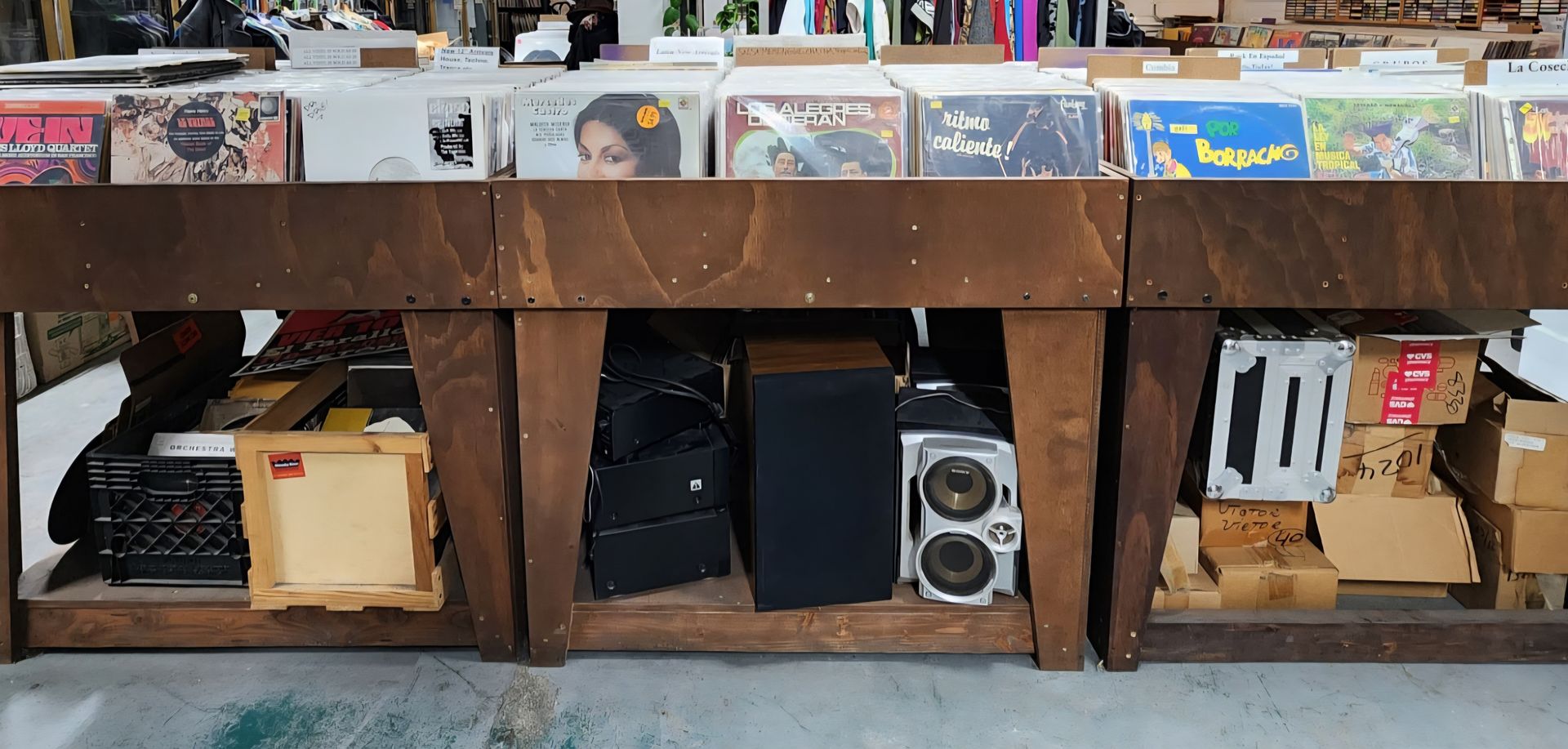 Large wood Brower bin holds 700+ with extra storage on top. LPs or 10" records. Located near DTLA