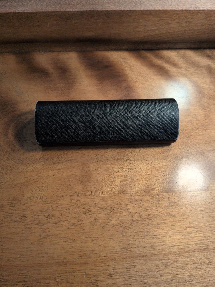 Black textured Prada brand glasses case. Light wear on the edge, letters mostly rubbed off on the inside. Fully closes, functional glasses case