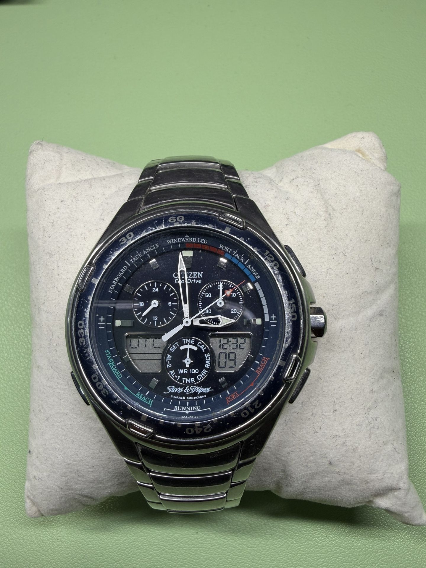 For sale here is a genuine men’s citizen eco drive wristwatch. This means it uses citizens’s proprietary movement that draws power from the sun to work solar powered. It is a very special watch that features an analog and digital display. It has a blue dial and blue rotating bezel. It is in great condition with small scratches and scuff marks around the rugged titanium case. It is a special edition Stars and Stripes from America’s Cup 2003. Chronograph register design great for yachting along with alarm and timer. Great digital displays functional! C660 S012902 HST For any questions please do not hesitate to ask and we will respond as soon as possible Thank you for looking and check out our page for more items like this!