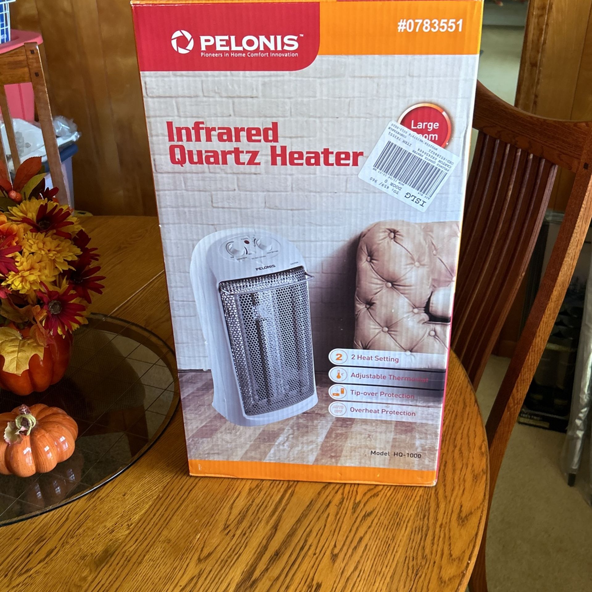 This is BNIB infrared quartz heater. For a large room. Two heat setting ,adjustable thermostat, tip over protection, overheat protection. Smoke-free home.