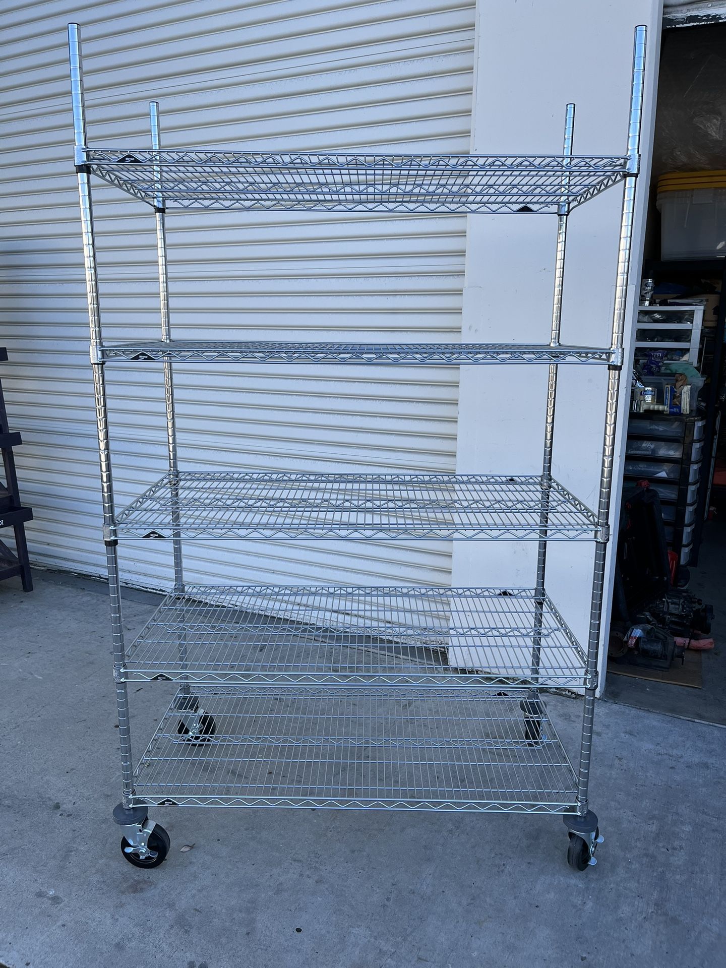 This 5-tier Super Erecta wire shelving stem caster cart consists five HD wire shelves for post four ball bearing caster rubber, locking wheels and the clips. The unit has an overall low capacity of 900 pounds. These units are commercial grade. msrp $941 each. Measurements 24x48x68