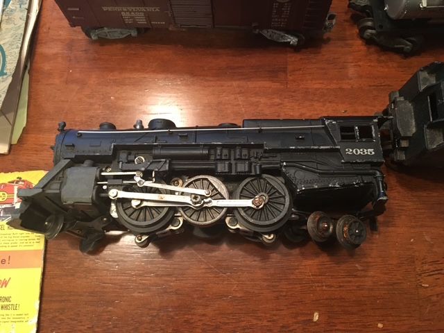 Train set includes multiple locomotive (2035), fright and crane cars, and tracks along with a number of accessories and most of the original instruction material. It was purchased new by my father in the 1950’s. It has been in storage for multiple decades.