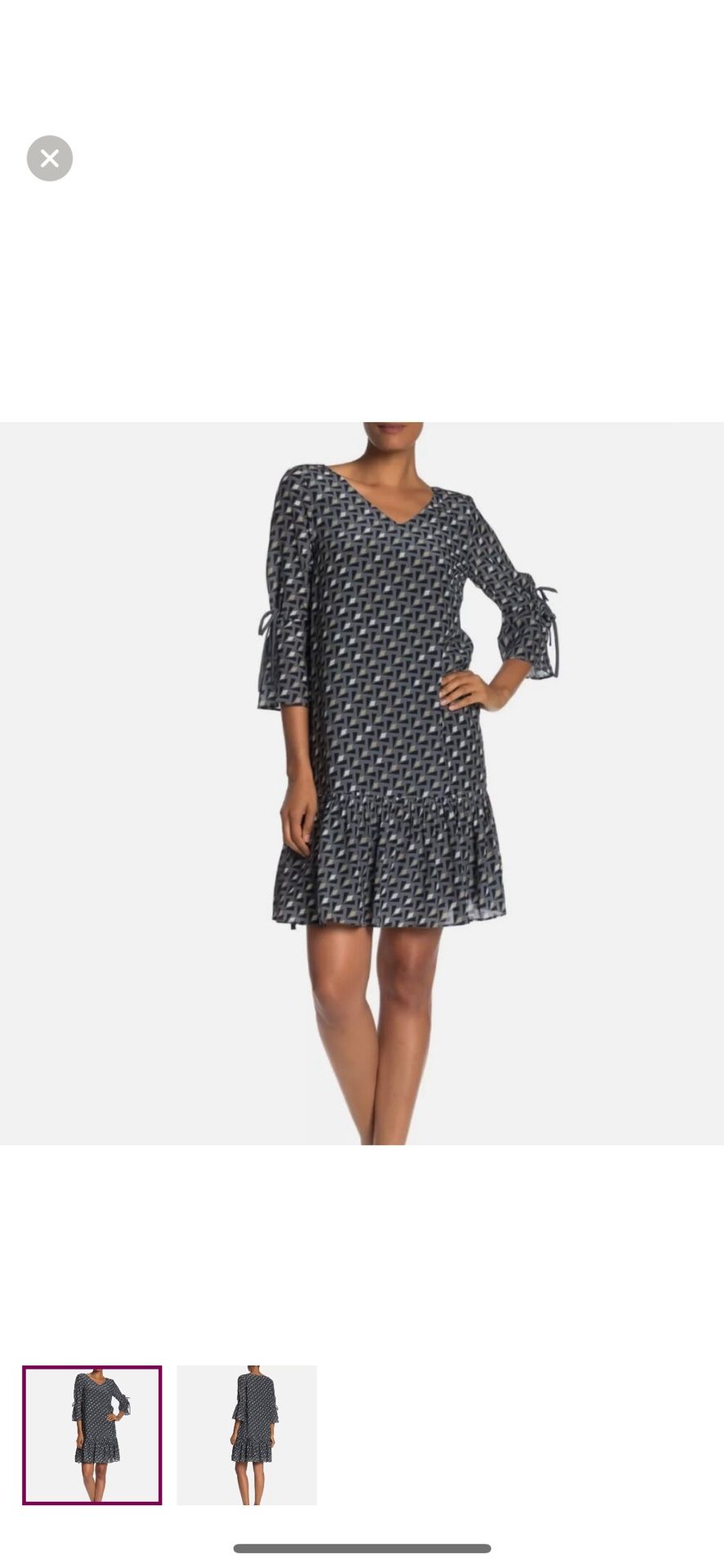 LAFAYETTE 148 New York Navy Blue Print ANAGRACE Silk V-Neck Dress Size: XL Color: Earl Grey Multi Tunneled drawstring ties gently flounce the flared cuffs and drop-waist ruffled hem of a shift cut from geo-print Italian silk. Slips on over head. V-neck. Three-quarter sleeves with drawstring bell cuffs. 100% silk. Dry clean. NEW WITH TAGS. Original price 698.