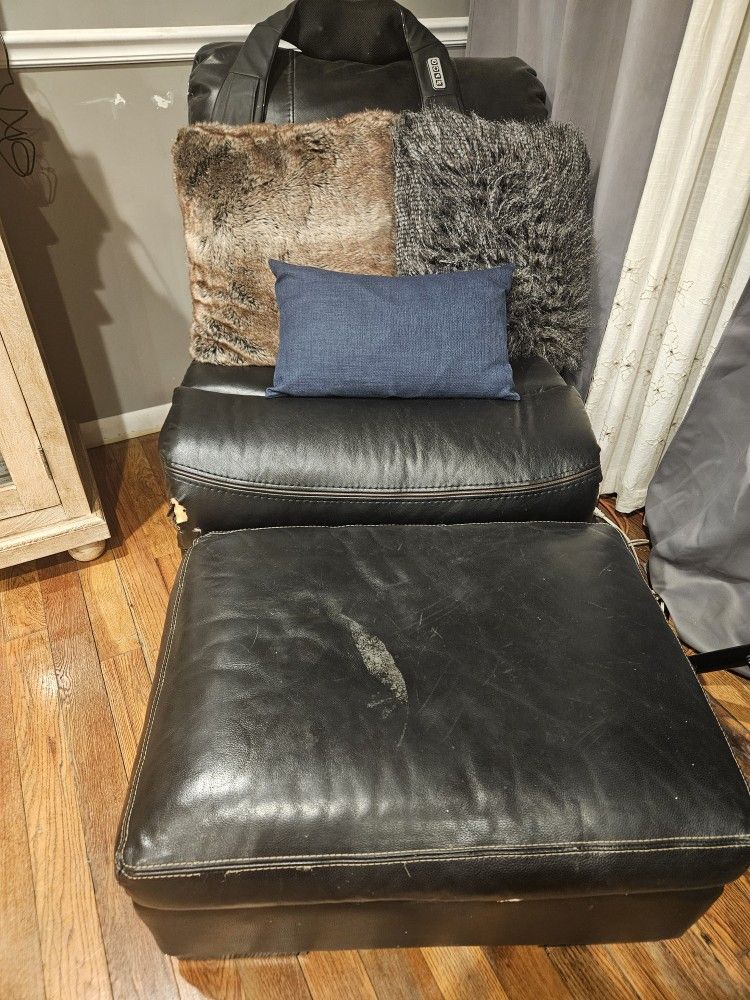1 leather sofa chair with power to recline with ottoman and a wide leather chair. Must move yourself