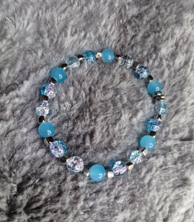 Description: Handmade stretch bracelet with blue glass beads and silver-tone spacers. Lightweight, comfortable, and easy to wear. Fits most wrists. Great for everyday wear or as a gift. Gently used / like new condition. Local shipping available.