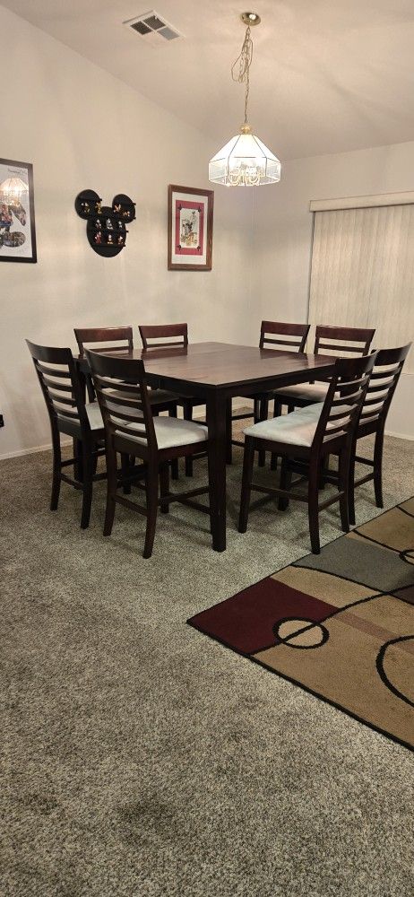 Square table seat 8. 53" by 54" Solid wood.