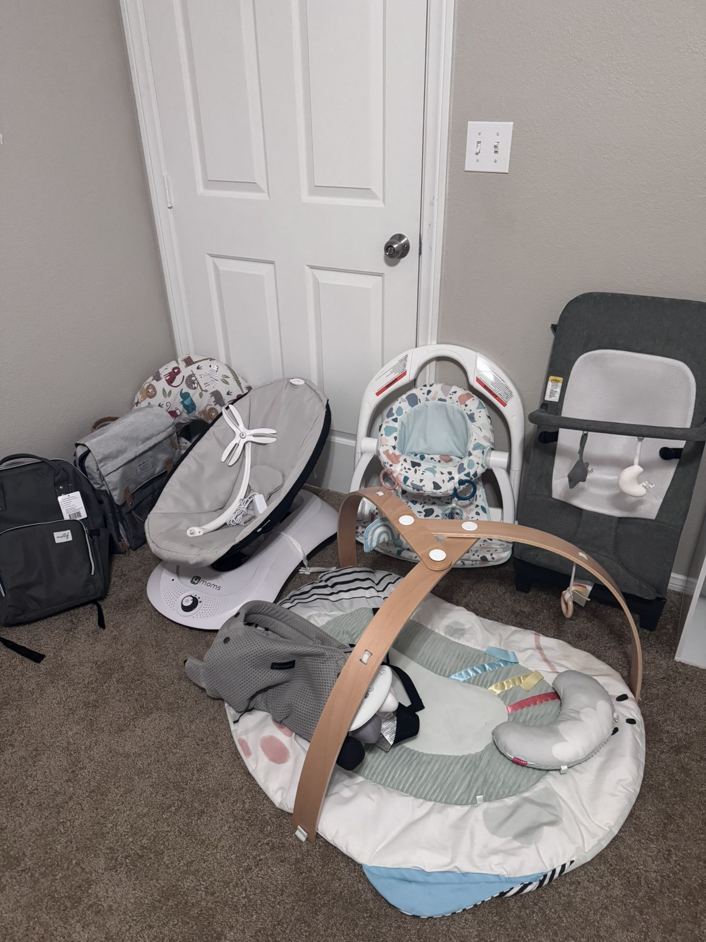 Left to right Motif pump bag Eddie Bauer diaper back pack Boppy pillow 4moms rockaroo Fisher price sit me up seat Baby delight bouncer Skip hop activity gym Momcozy mesh baby carrier 180$ for everything or best offer .
