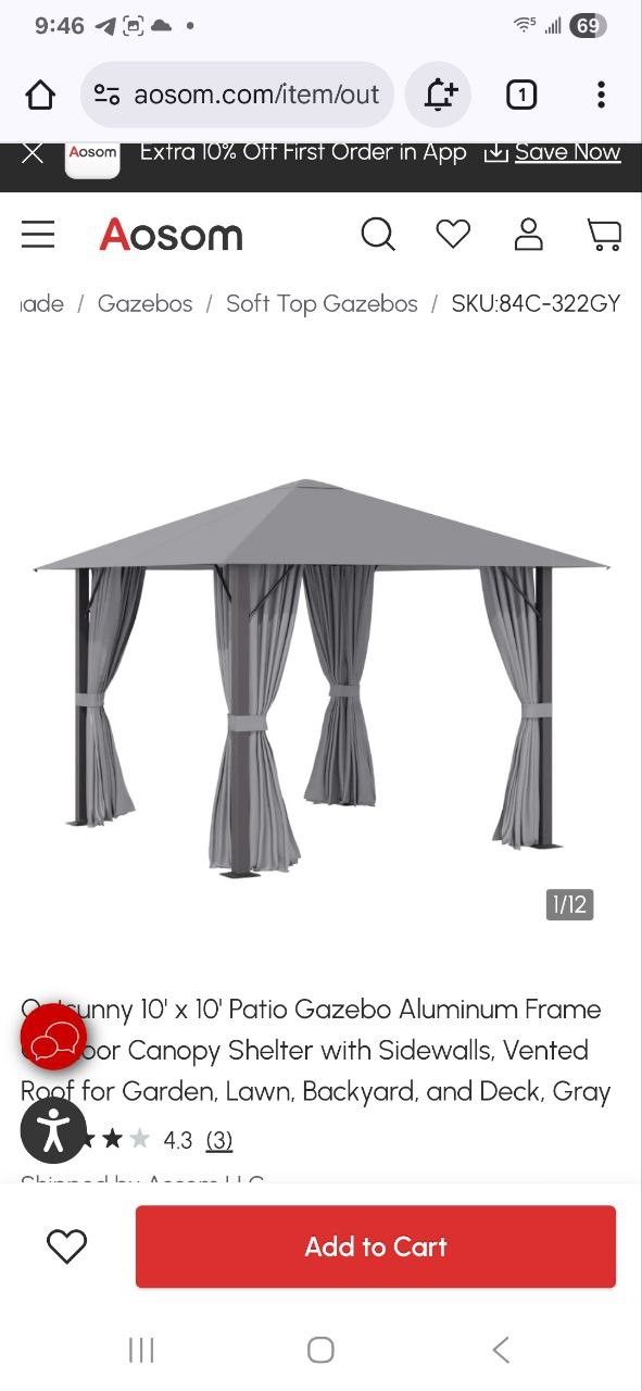 Outsunny 10' x 10' Patio Gazebo Aluminum Frame Outdoor Canopy Shelter with Sidewalls, Vented Roof for Garden, Lawn, Backyard, and Deck, Gray retail price is $299.99
