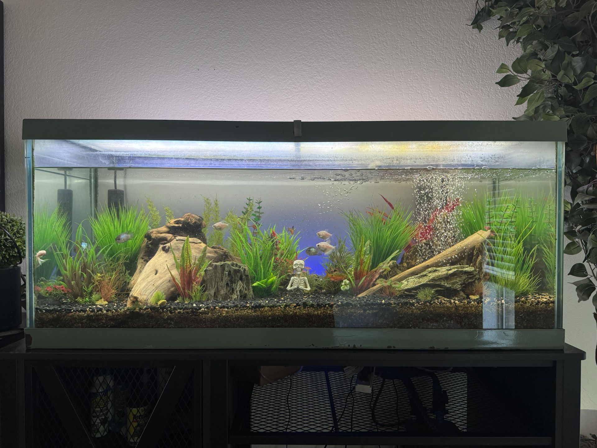 75 Gallon tank with stand. Large Canister filter, Heater, Timer Light and Airstone. Stand has built in power. Misc Chemicals and accessories. Also a large amount of decor including Dragon stone. I need to rehome fish if interested. I’m trying to move soon and the Large tank will be cumbersome.