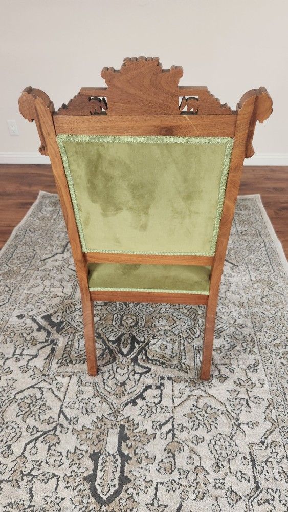 Incredible condition is this piece of antique furniture. Original wheels in great working condition. Redid the upholstery to the very soft, velvety feeling light green fabric of the era. The piece is very sturdy and waiting to start conversations in your home for years to come.