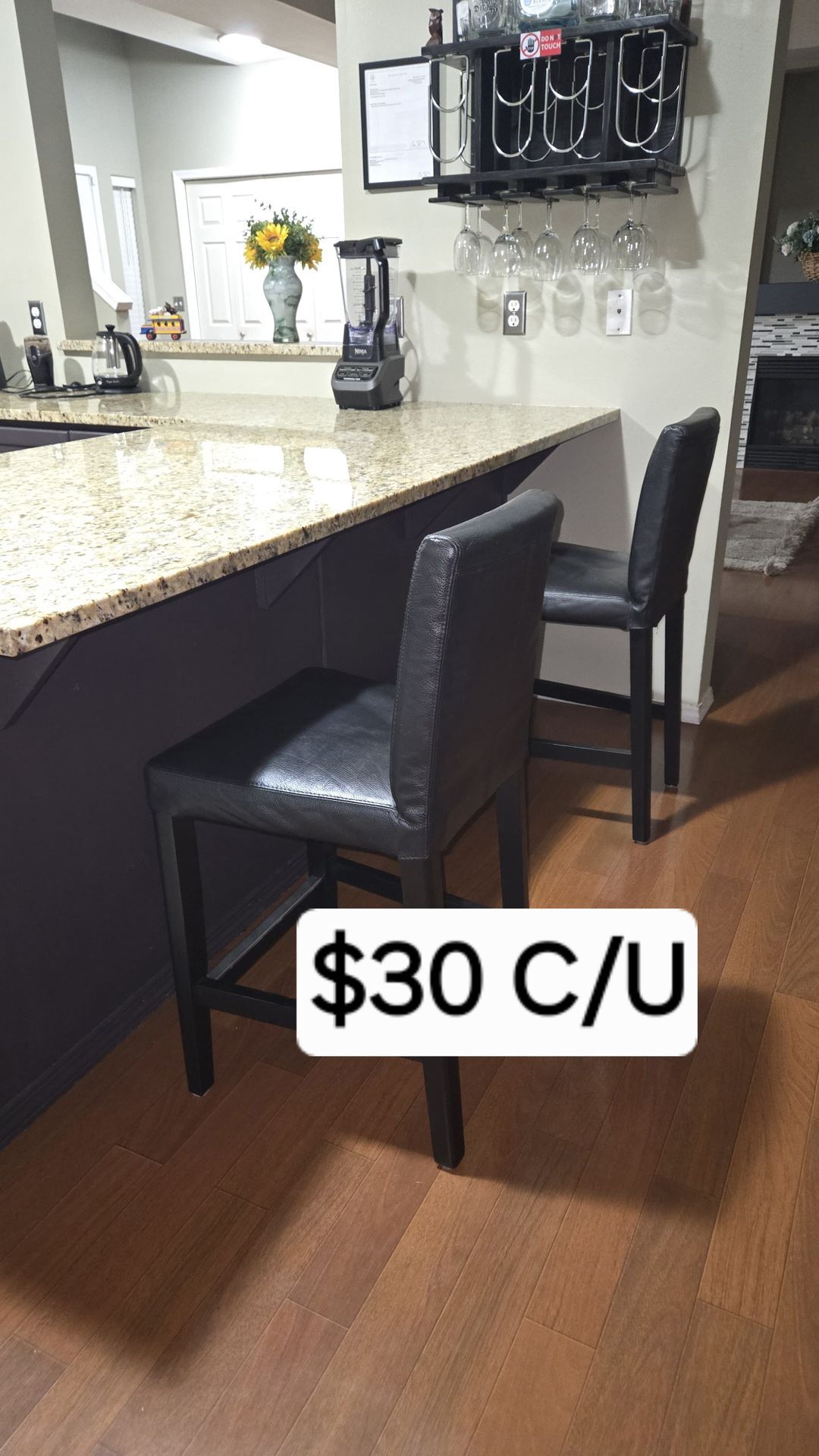 The Gymax 25-inch counter height bar stool features a durable rubber wood frame with a black finish and is upholstered in black faux leather with foam padding for comfort. Set of 2, selling together for total $60 cash, pickup only. Great condition and about $100 cheaper than buying them new
