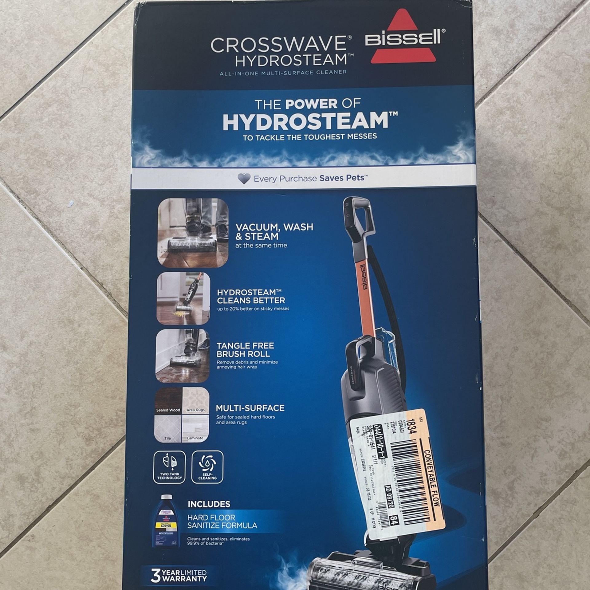 Vacuum, wash, and steam vac. That works on carpet, wood, tile, and laminate. Comes with multi- surface cleaners. Brand new- never used and still in unopened box.