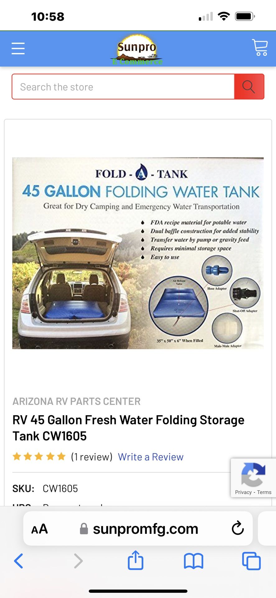 My price is firm !!! It is in Perfect condition .  We used it on top of our gearbox Toyhauler to haul extra water out to the Desert because we have a family of 8 . Very low profile so once it’s full of water it does not move at all . Filled with water it weighs 375 pounds Transport 45 gallons of water to your RV, coach or campsite the easy way. Fresh water tank stores on top of you truck cab, tow vehicle, in the trunk of your car or back of your SUV. Tanks are manufactured with dual baffles to provide added stability during transportation. Heavy gauge, FDA approved PVC material is durable and easy to repair if punctured. Comes with a hose adapter, shut-off adapter, male-male adapter, valve cap and repair kit. All you need is a hose to transfer water by gravity feed. This product, when filled with water, is limited for use in RV parks, campgrounds and on level ground. Not for highway use. Not for use on lightweight vehicles. Dimensions: Filled 35"W x 50"L x 6"H In Box 9 1/2"W x 13 1/4"L x 4 1/4"H