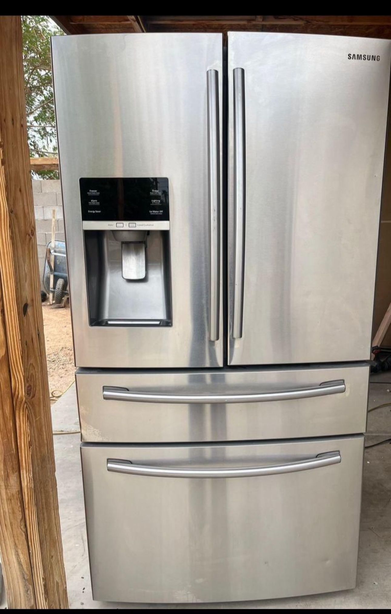 Refrigerator is plugged in working good, stainless steel, four doors, large capacity, asking 540 free delivery to your garage.
