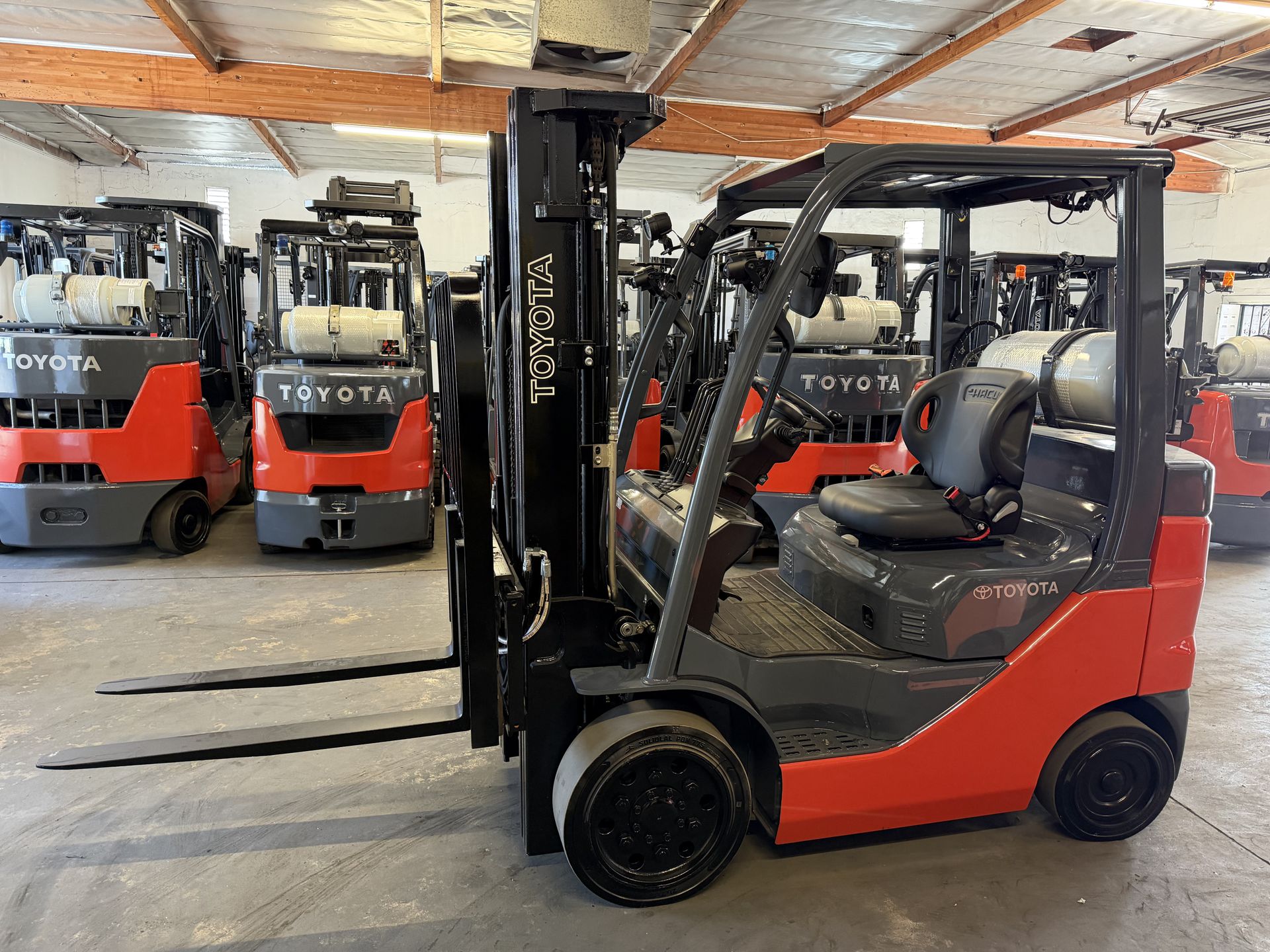 Toyota 8FGCU25 5,000lbs capacity 189" triple mast Sideshift 42" forks New Seat New battery New L/P tank Headlights Amber strobe light Back up alarm Fresh paint Financing Available OAC CMH 730 Arrow Highway La Verne 91750