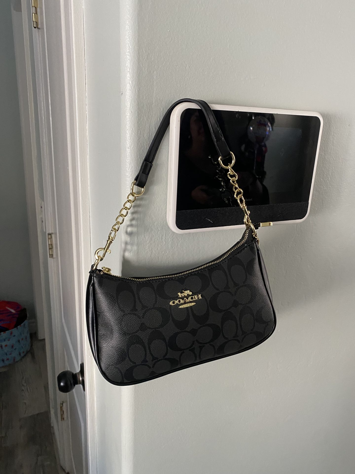 Sleek and sophisticated Coach Teri bag in "Smoke" signature canvas with black leather trim. Comes with both the shoulder chain strap and the adjustable crossbody strap for multiple styling options. Excellent condition with polished gold-tone hardware. Great for transitioning from day to night.