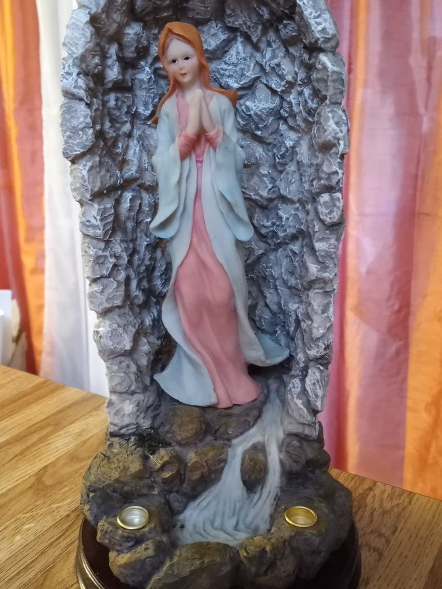 The Mirella Collection Religious Figure the Virgin Mary. This is a very lovely piece to add to your collection. It is preowned and in good condition can have signs of wear and tear. There are no cracks or chips on the figure/ statue. It measures 6"Lx 6"Wx 13"H. It has some weight to it. There are 2 spots to place some candles on it. On the bottom it has rubber feet to protect your surfaces. Please view photos carefully as part of description.