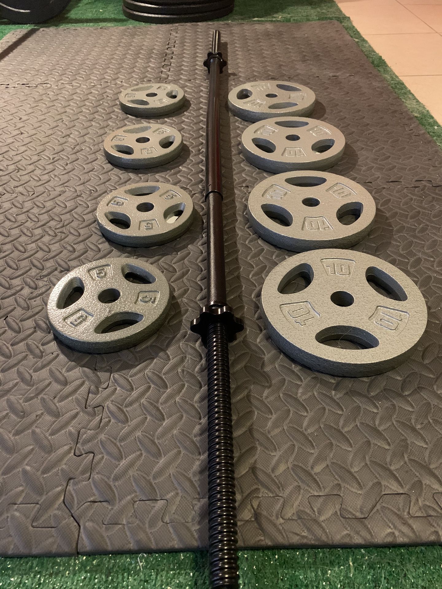 STANDARD SET: 1 straight bar 4- 10lb plates 4- 5 lb plates ALL fit 1” holes Brand new Taking offers on items or buy all weights $2/ pound Buy whole lot: $200 Pick up in Eagle rock or little Tokyo